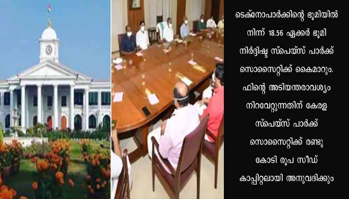 ടെക്നോപാര്ക്കിന്റെ ഭൂമിയില് നിന്ന് 18.56 ഏക്കര് ഭൂമി നിര്ദ്ദിഷ്ട സ്പെയ്സ് പാര്ക്ക് സൊസൈറ്റിക്ക് കൈമാറും. ഫണ്ടിന്റെ അടിയന്തരാവശ്യം നിറവേറ്റുന്നതിന് കേരള സ്പെയ്സ് പാര്ക്ക് സൊസൈറ്റിക്ക് രണ്ടു കോടി രൂപ സീഡ് കാപ്പിറ്റലായി അനുവദിക്കും.