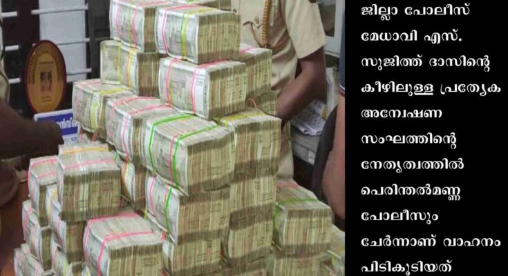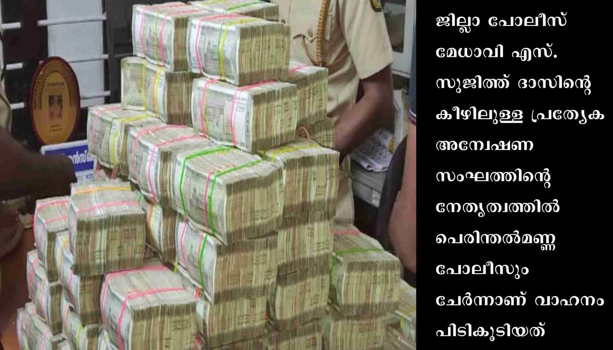 ജില്ലാ പോലീസ് മേധാവി എസ്. സുജിത്ത് ദാസിന്റെ കീഴിലുള്ള പ്രത്യേക അന്വേഷണസംഘത്തിന്റെ നേതൃത്വത്തില് പെരിന്തല്മണ്ണ പോലീസും ചേര്ന്നാണ് വാഹനം പിടികൂടിയത്. രഹസ്യവിവരത്തെത്തുടര്ന്ന് നടത്തിയ പരിശോധനയില് ഞായറാഴ്ച രാവിലെ 5.15-ഓടെയാണ് വാഹനം പിടികൂടിയത്. പരിശോധനയില് കാറിന്റെ മുന്സീറ്റിനടിയിലുണ്ടാക്കിയ അറയില് കെട്ടുകളാക്കി സൂക്ഷിച്ച നിലയിലായിരുന്നു പണം. അഞ്ഞൂറു രൂപയുടെ നോട്ടുകളാണ് കെട്ടുകളാക്കിയിരുന്നത്. ബംഗളൂരു രജിസ്ട്രേഷനിലുള്ളതാണു കാര്. അവിടെ നിന്നു മലപ്പുറം ജില്ലയിലേക്കും കൊടുവള്ളിയിലേക്കും ഹവാല ഇടപാടുകള്ക്കായി കൊണ്ടുവന്നതാണു പണമെന്നാണു സൂചന. മലപ്പുറം ജില്ലയില് രേഖകളില്ലാത്ത ഏറ്റവും കൂടുതല് തുക പിടികൂടിയ സംഭവവും ഇതാണെന്ന് പോലീസ് പറഞ്ഞു.