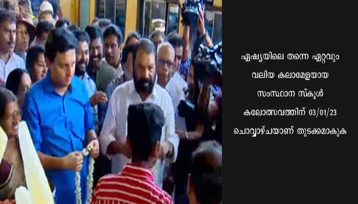 ഏഷ്യയിലെ തന്നെ ഏറ്റവും വലിയ കലാമേളയായ സംസ്ഥാന സ്കൂൾ കലോത്സവത്തിന് 03/01/23 ചൊവ്വാഴ്ചയാണ് തുടക്കമാകുക. പ്രധാനവേദിയായ വെസ്റ്റ്ഹിൽ ക്യാപ്റ്റൻ വിക്രം മൈതാനത്ത് പൊതുവിദ്യാഭ്യാസ ഡയറക്ടർ കെ.ജീവൻ ബാബു പതാക ഉയർത്തും.03/01/23 ചൊവ്വാഴ്ച രാവിലെ 10ന് മുഖ്യമന്ത്രി പിണറായി വിജയൻ ഉദ്ഘാടനം ചെയ്യും. മന്ത്രി വി.ശിവൻകുട്ടി അധ്യക്ഷനായിരിക്കും.