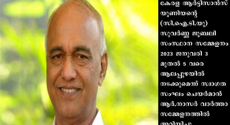 ആലപ്പുഴ: കേരള ആർട്ടിസാൻസ് യൂണിയന്റെ (സി.ഐ.ടി.യു) സുവർണ്ണ ജൂബലി സംസ്ഥാന സമ്മേളനം 2023 ജനുവരി 3 മുതൽ 5 വരെ ആലപ്പുഴയിൽ നടക്കുമെന്ന് സ്വാഗതസംഘം ചെയർമാൻ ആർ.നാസർ വാർത്താസമ്മേളനത്തിൽ അറിയിച്ചു. പ്രതിനിധി സമ്മേളനം ടൗൺഹാളിലും പൊതുസമ്മേളനം ഇ.എം.എസ് സ്റ്റേഡിയത്തിലും നടക്കും.