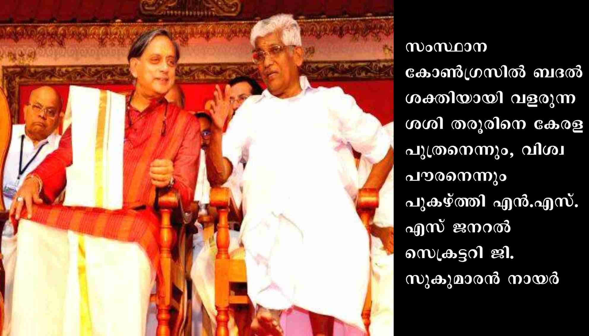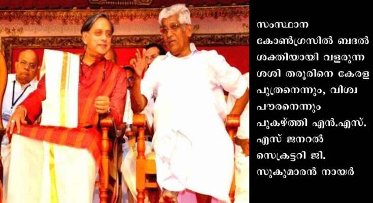 കോട്ടയം : സംസ്ഥാന കോൺഗ്രസിൽ ബദൽ ശക്തിയായി വളരുന്ന ശശി തരൂരിനെ കേരള പുത്രനെന്നും, വിശ്വപൗരനെന്നും പുകഴ്ത്തി എൻ.എസ്.എസ് ജനറൽ സെക്രട്ടറി ജി.സുകുമാരൻ നായർ. മന്നം ജയന്തി ആഘോഷത്തിന്റെ ഭാഗമായി പെരുന്നയിൽ നടന്ന നായർ സമ്മേളനത്തിൽ സ്വാഗതം ആശംസിക്കവെയാണ് ഉദ്ഘാടകനായ തരൂരിനെ അദ്ദേഹം പുകഴ്ത്തിയത്. ഡൽഹി നായരെന്ന് മുൻപ് താൻ വിളിച്ചത് തെറ്റായിപ്പോയെന്ന് തുറന്നു പറഞ്ഞ സുകുമാരൻ നായർ, തെറ്റ് തിരുത്താനാണ് സമ്മേളനത്തിന് ക്ഷണിച്ചതെന്നും, മന്നം ജയന്തി ഉദ്ഘാടനം ചെയ്യാൻ തരൂരിനോളം അർഹനായ മറ്റൊരാളില്ലെന്നും പറഞ്ഞു.മന്നം ജയന്തി സമ്മേളനത്തിലെ പരാമർശത്തിന് പിന്നാലെ മുൻ മുഖ്യമന്ത്രി ഉമ്മൻ ചാണ്ടിയെ സന്ദർശിച്ച് ശശി തരൂർ എം പി.