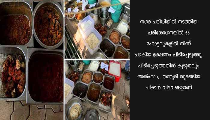 കണ്ണൂർ നഗരത്തിൽ മാത്രം 58 ഹോട്ടലുകളിൽ നിന്ന് പഴകിയ ഭക്ഷണം പിടിച്ചു. എം ആർ എ ബേക്കറി, എം വി കെ റസ്റ്റോറന്റ്, സെവൻത് ലോഞ്ച്, പ്രേമ കഫേ, സീതാപാനി ഹോട്ടൽ, ബർക്ക ഹോട്ടൽ, ഡി ഫിൻലാന്റ് ഹോട്ടൽ, ഹംസ ടീ ഷോപ്പ്, ഗ്രീഷ്മ ഹോട്ടൽ, മറാബി റസ്റ്റോറന്റ്, കൽപക ഹോട്ടൽ എന്നിങ്ങനെ 58 ഹോട്ടലുകളിൽ നിന്നാണ് ഭക്ഷ്യ വസ്തുക്കൾ പിടിച്ചത്. ഏഴ് സ്ക്വാഡുകളായി തിരിഞ്ഞായിരുന്നു ഭക്ഷ്യ സുരക്ഷാ വിഭാഗത്തിന്റെ പരിശോധന. പുഴുവരിക്കുന്ന രീതിയിലുള്ള ഭക്ഷ്യ യോഗ്യമല്ലാത്ത ഭക്ഷണമാണ് പിടിച്ചെടുത്തതെല്ലാം. ഭക്ഷ്യവിഷബാധകൾ ആവർത്തിക്കുമ്പോഴും മതിയായ രീതിയിൽ ലാബ് പരിശോധനാ സംവിധാനം കേരളത്തിലില്ലെന്നത് തിരിച്ചടിയാണ്.