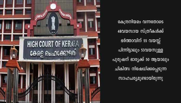 കൊച്ചി: കൃത്രിമ ഗർഭധാരണ നിയന്ത്രണ നിയമത്തിൽ നിർണ്ണായക വിധിയുമായി കേരള ഹൈക്കോടതി. അൻപത് വയസ് കഴിഞ്ഞ സത്രീകൾക്കും 55വയസ് പിന്നിട്ട പുരുഷനും ചികിത്സ നിഷേധിക്കുന്ന ചട്ടത്തിലാണ് ഹൈക്കോടതി ഉത്തരവ്. കേന്ദ്രസർക്കാർ നിയമഭേദഗതി കൊണ്ടുവന്ന സമയം ചികിത്സ തുടങ്ങിയവർക്ക് ചികിത്സ തുടരാമെന്നാണ് കേരള ഹൈക്കോടതി വിധി.