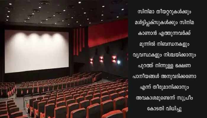 സിനിമാ തീയറ്ററുകള്ക്കും, മൾട്ടിപ്ലക്സുകൾക്കും സിനിമ കാണാന് എത്തുന്നവര്ക്ക് മുന്നില് നിബന്ധനകളും വ്യവസ്ഥകളും നിശ്ചയിക്കാനും പുറത്ത് നിന്നുള്ള ഭക്ഷണപാനീയങ്ങൾ അനുവദിക്കണോ എന്ന് തീരുമാനിക്കാനും അവകാശമുണ്ടെന്ന് സുപ്രീം കോടതി വിധിച്ചു. എന്നാല് കാഴ്ചക്കാര്ക്ക് സൌജന്യ കുടിവെള്ളം നല്കണമെന്ന് കോടതി പറഞ്ഞു.