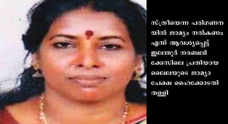 കൊച്ചി: സ്ത്രീയെന്ന പരിഗണനയിൽ ജാമ്യം നൽകണം എന്ന് ആവശ്യപ്പെട്ട് ഇലന്തൂർ നരബലിക്കേസിലെ പ്രതിയായ ലൈലയുടെ ജാമ്യാപേക്ഷ ഹൈക്കോടതി തള്ളി. നരബലി കേസിലെ മൂന്നാം പ്രതിയാണ് ലൈല. പത്മ, റോസ് ലിൻ എന്നിവരെ നരബലി ചെയ്ത കേസുകളിൽ കുറ്റപത്രം സമർപ്പിക്കാനിരിക്കെയാണ് ലൈല ജാമ്യാപേക്ഷയുമായി കോടതിയെ സമീപിച്ചത്. എന്നാൽ, ലൈലയുടെ ആവശ്യം കോടതി നിരാകരിച്ചു.