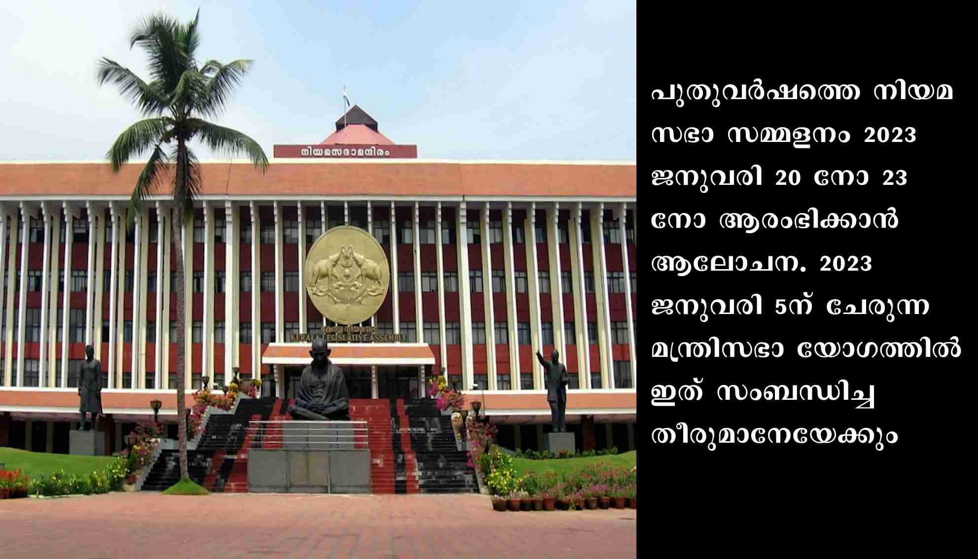തിരുവനന്തപുരം : പുതുവര്ഷത്തെ നിയമസഭാ സമ്മളനം 2023 ജനുവരി 20 നോ 23 നോ ആരംഭിക്കാന് ആലോചന. 2023 ജനുവരി 5ന് ചേരുന്ന മന്ത്രിസഭാ യോഗത്തില് ഇത് സംബന്ധിച്ച തീരുമാനേയേക്കും. 20 ന് സഭ ചേര്ന്ന് നയപ്രഖ്യാപനം അവതരിപ്പിച്ചാല് 23 മുതല് 25 വരെ നന്ദിപ്രമേയ ചര്ച്ച പാസാക്കി സമ്മേളനം തല്ക്കാലം നിര്ത്തിവയ്ക്കും. പിന്നീട് ഫെബ്രുവരി മൂന്നിന് പുനരാരംഭിച്ച് ബഡ്ജറ്റവതരിപ്പിക്കുകയും ആറുമുതല് എട്ടുവരെ അതിന്മേലുളള പൊതുചര്ച്ച പൂര്ത്തിയാക്കി പിരിയുകയുമാണ് സര്ക്കാര് ആലോചിക്കുന്ന ഒരുവഴി. 23ന് നയപ്രഖ്യാപനം നടത്തിയാല് നന്ദിപ്രമേയ ചര്ച്ച 2 ദിവസമായി ചുരുക്കും.