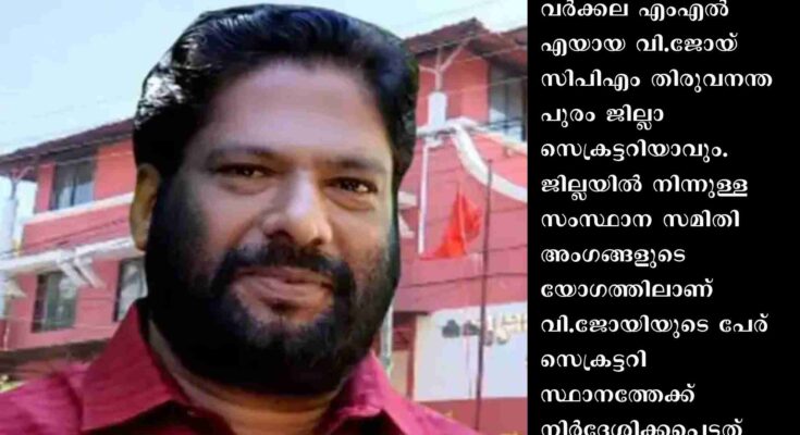 തിരുവനന്തപുരം: വർക്കല എംഎൽഎയായ വി.ജോയ് സിപിഎം തിരുവനന്തപുരം ജില്ലാ സെക്രട്ടറിയാവും. ജില്ലയിൽ നിന്നുള്ള സംസ്ഥാന സമിതി അംഗങ്ങളുടെ യോഗത്തിലാണ് വി.ജോയിയുടെ പേര് സെക്രട്ടറി സ്ഥാനത്തേക്ക് നിർദേശിക്കപ്പെട്ടത്. പല മുതിർന്ന നേതാക്കളുടേയും പേരുകൾ സെക്രട്ടറി സ്ഥാനത്തേക്ക് വന്നതോടെ സമവായം എന്ന നിലയിലാണ് വി.ജോയിക്ക് ജില്ലാ സെക്രട്ടറി സ്ഥാനത്തേക്ക് വഴി തുറന്നത്. നിർണായക യോഗത്തിൽ മുഖ്യമന്ത്രി പിണറായി വിജയനും പങ്കെടുത്തിരുന്നു.