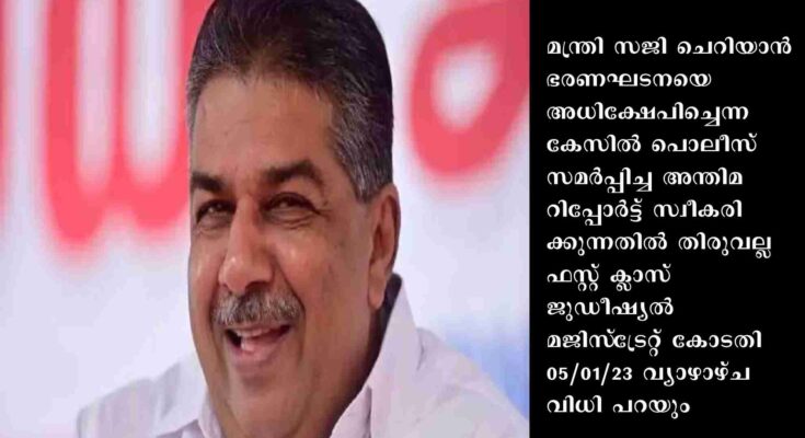 തിരുവനന്തപുരം: മന്ത്രി സജി ചെറിയാന് ഭരണഘടനയെ അധിക്ഷേപിച്ചെന്ന കേസില് പൊലീസ് സമര്പ്പിച്ച അന്തിമ റിപ്പോര്ട്ട് സ്വീകരിക്കുന്നതില് തിരുവല്ല ഫസ്റ്റ് ക്ലാസ് ജുഡീഷ്യല് മജിസ്ട്രേറ്റ് കോടതി 05/01/23 വ്യാഴാഴ്ച വിധി പറയും. പൊലീസ് റിപ്പോര്ട്ട് കോടതി അംഗീകരിക്കരുതെന്നായിരുന്നു 04/01/23 ബുധനാഴ്ച കേസ് പരിഗണിച്ചപ്പോള് പരാതിക്കാരനായ അഭിഭാഷകന് ആവശ്യപ്പെട്ടിരുന്നത്.
