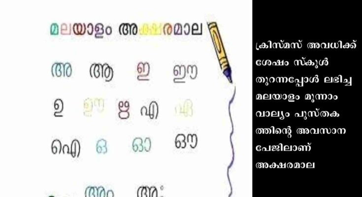 തിരുവനന്തപുരം: ഒന്നാം ക്ലാസിലെ പാഠപുസ്‌തകത്തിലും മലയാളം അക്ഷരമാല മടങ്ങിയെത്തി.ക്രിസ്‌മസ് അവധിക്ക് ശേഷം സ്‌കൂൾ തുറന്നപ്പോൾ ലഭിച്ച മലയാളം മൂന്നാം വാല്യം പുസ്തകത്തിന്റെ അവസാന പേജിലാണ് അക്ഷരമാല. സർക്കാർ ഭാഷാ പരിഷ്‌കരണ സമിതി നിർദേശിച്ച അക്ഷരമാലയാണിത്. രണ്ടാം ക്ലാസിലെ മലയാളം പുസ്തകത്തിന്റെ രണ്ടാം വാല്യത്തിൽ തന്നെ അക്ഷരമാല ഉൾപ്പെടുത്തിയിരുന്നു.