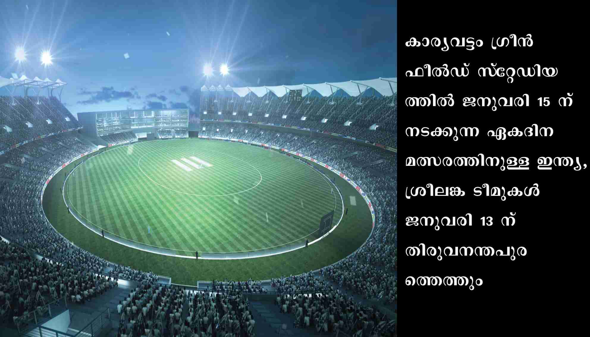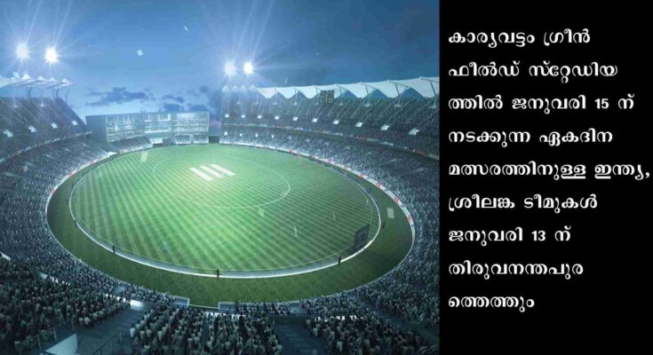 തിരുവനന്തപുരം: കാര്യവട്ടം ഗ്രീന്ഫീല്ഡ് സ്റ്റേഡിയത്തില് ജനുവരി 15 ന് നടക്കുന്ന ഏകദിന മത്സരത്തിനുള്ള ഇന്ത്യ, ശ്രീലങ്ക ടീമുകള് ജനുവരി 13 ന് തിരുവനന്തപുരത്തെത്തും. മൂന്നു ടി20 മത്സരങ്ങളിലും മൂന്ന് ഏകദിന മത്സരങ്ങളിലുമാണ് ഇന്ത്യയും ശ്രീലങ്കയും ഏറ്റുമുട്ടുന്നത്. ഏകദിന പരമ്പരയിലെ അവസാന മത്സരമാണ് കാര്യവട്ടം ഗ്രീന്ഫീല്ഡ് സ്േറ്റഡിയത്തില് നടക്കുന്നത്.