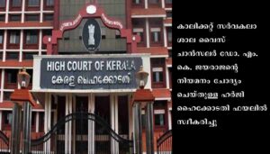 വി.സി. പദവിക്കുള്ള അപേക്ഷകരില് നിന്ന് ശിപാര്ശചെയ്യുന്ന വ്യക്തിയുടെ സവിശേഷതകള് സെര്ച്ച് കമ്മിറ്റി ചൂണ്ടിക്കാട്ടിയിട്ടില്ലെന്നും അത് പരിശോധിക്കാതെയാണ് ഗവര്ണര് ഏകപക്ഷീയമായി കാലിക്കറ്റ് വി.സിയായി എം.കെ. ജയരാജിനെ നിയമിച്ചതെന്നും ഹര്ജിയില് പറയുന്നു. ഹര്ജിയില് 13-ന് വാദം കേള്ക്കും. സുപ്രീം കോടതി വിധിയുടെ അടിസ്ഥാനത്തില് ഗവര്ണര് വൈസ് ചാന്സലര്മാര്ക്ക് നല്കിയിട്ടുള്ള കാരണം കാണിക്കല് നോട്ടീസ് ചോദ്യംചെയ്ത് വി.സിമാര് നല്കിയിട്ടുള്ള ഹര്ജിയില് അവസാനവാദം കേള്ക്കുന്നതും ജനുവരി 13നാണ്. ഹര്ജിക്കാരനുവേണ്ടി സീനിയര് അഭിഭാഷകന് ജോര്ജ് പൂന്തോട്ടം ഹാജരായി. ചാന്സലര് കൂടിയായ ഗവര്ണര്, കാലിക്കറ്റ് സര്വകലാശാല എന്നിവരെയും എതിര്കക്ഷികളാക്കിയാണ് ഹര്ജി.