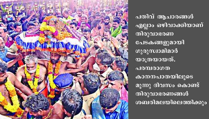 പന്തളം: രാജകുടുംബാംഗത്തിന്റെ മരണത്തെത്തുടര്‍ന്നു ആചാരവും ആര്‍ഭാടവും ആഘോഷവും ഇല്ലാതെ തിരുവാഭരണ ഘോഷയാത്ര ശബരിമലയ്ക്കു പുറപ്പെട്ടു. ഉച്ചയ്ക്കു ഒരു മണിയ്ക്ക് കൃഷ്ണപ്പരുന്ത് ആകാശത്തു വട്ടമിട്ടു പറന്നതോടെയാണ് ഘോഷയാത്ര പുറപ്പെട്ടത്.