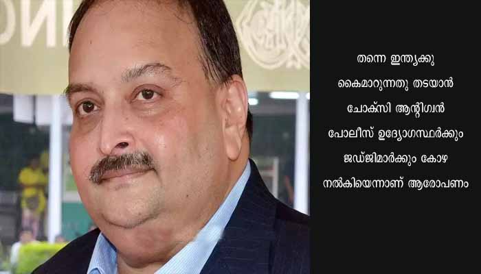 തന്നെ ഇന്ത്യക്കു കൈമാറുന്നതു തടയാന് ചോക്സി ആന്റിഗ്വന് പോലീസ് ഉദ്യോഗസ്ഥര്ക്കും ജഡ്ജിമാര്ക്കും കോഴ നല്കിയെന്നാണ് ആരോപണം. പ്രമുഖ സാമ്പത്തിക കുറ്റാന്വേഷകന് കെന്നത്ത് റിജോക്കാണു ”ബ്ലോഗറി”ല് എഴുതിയ ലേഖനത്തിലൂടെ ഈ വെളിപ്പെടുത്തല് നടത്തിയത്. ആന്റിഗ്വയിലെ മുതിര്ന്ന പോലീസ് ഉദ്യോഗസ്ഥന് അഡോണിസ് ഹെന്റി, മജിസ്ട്രേറ്റ് കോണ്ലിഫെ ക്ലാര്ക്കെ തുടങ്ങിയവര്ക്കു കോഴ നല്കി, അവിടുത്തെ കോടതി നടപടികള് പരമാവധി നീട്ടാനാണു ചോക്സിയുടെ ശ്രമമെന്നു റിജോക് ചൂണ്ടിക്കാട്ടി. ചോക്സിയുടെ ഉടമസ്ഥതയിലുള്ള അല് പോര്ട്ടോ ഹോട്ടലില് ഇന്സ്പെക്ടര് ഹെന്റിയുമായി അദ്ദേഹം ദിവസത്തില് മൂന്നുതവണയെങ്കിലും കൂടിക്കാഴ്ച നടത്തിയിട്ടുണ്ട്.