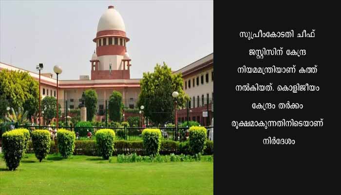 ദില്ലി: കൊളിജീയം തർക്കത്തിൽ പുതിയ നിർദ്ദേശവുമായി കേന്ദ്ര സർക്കാർ. കൊളിജീയത്തിൽ സർക്കാർ പ്രതിനിധിയെ ഉൾപ്പെടുത്തണമെന്നാവശ്യപ്പെട്ട് കേന്ദ്രം കത്ത് നൽകി. സുപ്രീംകോടതി ചീഫ് ജസ്റ്റിസിന് കേന്ദ്ര നിയമമന്ത്രിയാണ് കത്ത് നൽകിയത്. കൊളിജീയം-കേന്ദ്രം തർക്കം രൂക്ഷമാകുന്നതിനിടെയാണ് നിർദേശം.