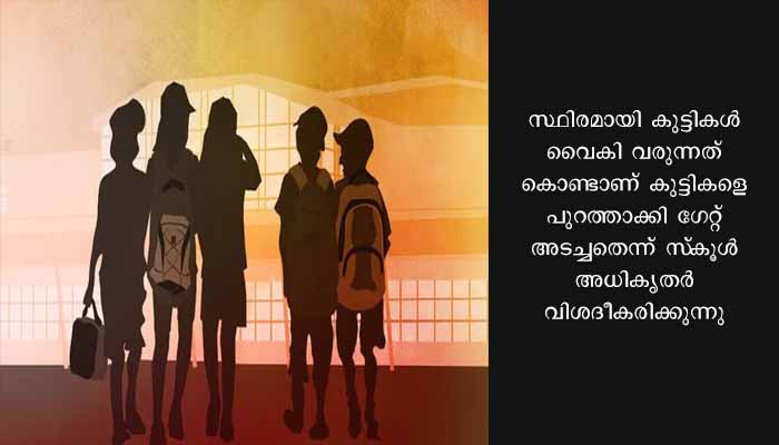 ഒന്പതി മണി മുതലാണ് സ്കൂളില് ക്ലാസുകള് ആരംഭിക്കുന്നത്. 9 മണിക്ക് ശേഷം തന്നെ ഗേറ്റ് അടയ്ക്കുകയായിരുന്നു. 9.30ന് തൊട്ടുമുന്പായാണ് കുട്ടികളെത്തിയത്. സ്ഥിരമായി കുട്ടികള് വൈകി വരുന്നത് കൊണ്ടാണ് കുട്ടികളെ പുറത്താക്കി ഗേറ്റ് അടച്ചതെന്ന് സ്കൂള് അധികൃതര് വിശദീകരിക്കുന്നു. സ്കൂളിന് തൊട്ടടുത്തായി ഒരു ട്യൂഷന് സെന്റര് പ്രവര്ത്തിക്കുന്നുണ്ട്. ട്യൂഷന് സെന്ററില് 9.10ഓടെയാണ് ക്ലാസുകള് അവസാനിക്കുന്നത്. ട്യൂഷന് സെന്ററില് പോകുന്ന കുട്ടികള് സ്ഥിരമായി വൈകി വരാറുണ്ടെന്നാണ് അധികൃതര് പറയുന്നത്. കുട്ടികളുടെ മാതാപിതാക്കള് എത്തിയ ശേഷം വേണ്ട നടപടികള് തീരുമാനിക്കുമെന്നും സ്കൂള് അധികൃതര് വ്യക്തമാക്കി.