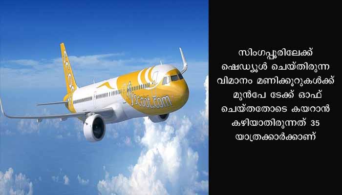 സ്കൂട്ട് എയര്ലൈന് വിമാനം രാത്രി 7.55നാണ് പുറപ്പെടേണ്ടിയിരുന്നതെങ്കിലും 18/01/23 ബുധനാഴ്ച ഉച്ചകഴിഞ്ഞ് മൂന്നിനാണ് പറന്നുയര്ന്നത്. ഇതോടെയാണ് വിമാനം പുറപ്പെടുന്ന സമയം അറിയാതെ 35 പേര്ക്ക് യാത്ര മുടങ്ങിയത്.