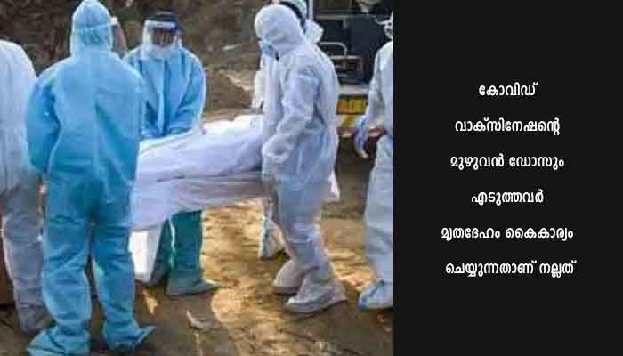 60 വയസിന് മുകളിലുള്ളവരും ഹൃദ്രോഗം, പ്രമേഹം മുതലായ ഗുരുതര രോഗമുള്ളവരും കോവിഡ് ബാധിച്ച് മരണപ്പെട്ടയാളുടെ മൃതദേഹവുമായി നേരിട്ടിടപെടരുത്. കോവിഡ് വാക്സിനേഷന്റെ മുഴുവൻ ഡോസും എടുത്തവർ മൃതദേഹം കൈകാര്യം ചെയ്യുന്നതാണ് നല്ലത്. മൃതദേഹം സൂക്ഷിച്ച സ്ഥലങ്ങൾ സോഡിയം ഹൈപ്പോക്ലോറൈറ്റ് ലായനി ഉപയോഗിച്ച് വൃത്തിയാക്കണം.