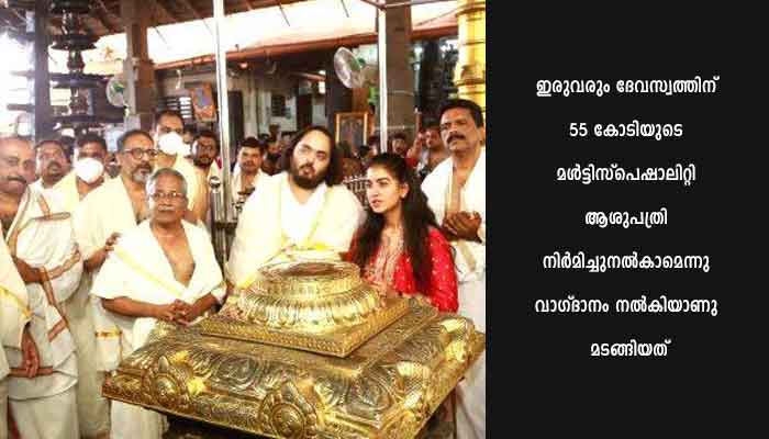 ഗുരുവായൂര്: റിലയന്സ് ഇന്ഡസ്ട്രീസ് ചെയര്മാന് മുകേഷ് അംബാനിയുടെ മകന് ആനന്ദ് അംബാനിയും പ്രതിശ്രുത വധു രാധികാ മര്ച്ചന്റും ഗുരുവായൂര് ക്ഷേത്രത്തില് ദര്ശനം നടത്തി. വിവാഹത്തിനു മുന്നോടിയായി ഗുരുവായൂരപ്പന്റെ അനുഗ്രഹം തേടിയെത്തിയ ഇരുവരും ദേവസ്വത്തിന് 55 കോടിയുടെ മള്ട്ടിസ്പെഷാലിറ്റി ആശുപത്രി നിര്മിച്ചുനല്കാമെന്നു വാഗ്ദാനം നല്കിയാണു മടങ്ങിയത്.