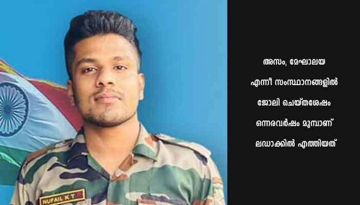 നുഫൈല് ജോലി ചെയ്യുന്ന മേഖലയില് അതിശൈത്യമാണ് അനുഭവപ്പെട്ടിരുന്നത്. വ്യാഴാഴ്ച രാവിലെ നുഫൈലിന് ശ്വാസതടസം അനുഭവപ്പെട്ടതിനെ തുടര്ന്ന് ലഡാക്കിലെ സൈനിക ആശുപത്രിയില് ചികിത്സ തേടിയിരുന്നു. എന്നാല് വൈകീട്ട് അഞ്ചുമണിയോടെ നുഫൈലിന് ജീവന് നഷ്ടപ്പെടുകയായിരുന്നു. കഴിഞ്ഞ എട്ടു വര്ഷമായി ആര്മി പോസ്റ്റല് സര്വീസില് ശിപായിയായി ജോലി ചെയ്തു വരികയായിരുന്നു നുഫൈല്. അസം, മേഘാലയ എന്നീ സംസ്ഥാനങ്ങളില് ജോലി ചെയ്തശേഷം ഒന്നരവര്ഷം മുമ്പാണ് ലഡാക്കില് എത്തിയത്. ഇവിടെ ആറുമാസം കൂടി പൂര്ത്തിയാക്കി മറ്റൊരിടത്തേക്ക് മാറാനിരിക്കെയാണ് നുഫൈലിന്റെ വിയോഗം. ഭൗതികശരീരം നാട്ടിലെത്തിക്കാനുള്ള നടപടികള് പുരോഗമിക്കുകയാണ്. കൊടുവങ്ങാട് മിച്ചഭൂമി മൈതാനത്തും വീട്ടിലും മൃതദേഹം പൊതുദര്ശനത്തിനു വെക്കും. സൈനിക നടപടികള് പ്രകാരം ഖബറടക്കും.