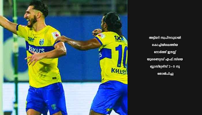 കൊച്ചി: തുടര് പരാജയങ്ങളില് വീണ കേരള ബ്ലാസ്റ്റേഴ്സിന് സ്വന്തം ഗ്രൗണ്ടില് മിന്നും ജയം. ഒന്പതാം സീസണിലെ ഒരു അട്ടിമറി സ്വപ്നവുമായി കൊച്ചിയിലെത്തിയ നോര്ത്ത് ഈസ്റ്റ് യുണൈറ്റഡ് എഫ്.സിയെ ബ്ലാസ്റ്റേഴ്സ് 2-0 നു തോല്പിച്ചു.