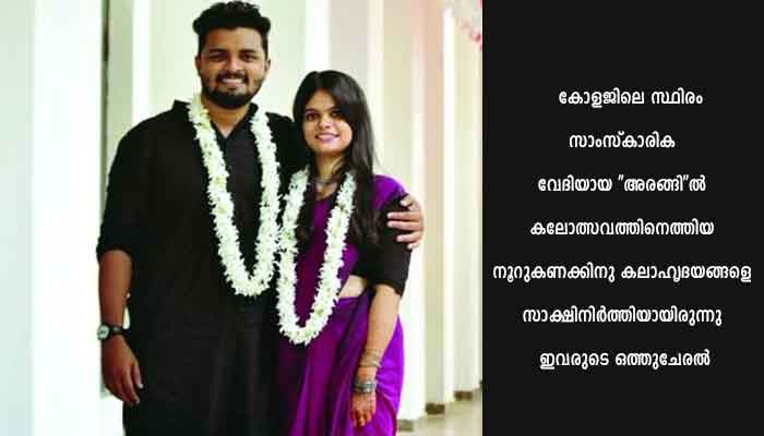 കൊച്ചി: എം.ജി. സര്വകലാശാല കലോത്സവത്തിന്റെ മുഖ്യവേദിയായ മഹാരാജാസ് കോളജ് ഇന്നലെ വിവാഹവേദിയായി. മഹാരാജാസ് കോളജില് 2014-17 കാലത്തു ബിരുദ വിദ്യാര്ഥികളായിരുന്ന കൃപയും നദീമുമാണ് കലോത്സവേദിയില് വിവാഹിതരായത്. കോളജിലെ സ്ഥിരം സാംസ്കാരിക വേദിയായ ”അരങ്ങി”ല് കലോത്സവത്തിനെത്തിയ നൂറുകണക്കിനു കലാഹൃദയങ്ങളെ സാക്ഷിനിര്ത്തിയായിരുന്നു ഇവരുടെ ഒത്തുചേരല്. അഞ്ചുവര്ഷത്തെ പ്രണയത്തിനൊടുവിലാണ് മട്ടാഞ്ചേരി സ്വദേശിയായ നദീമും പനങ്ങാട് സ്വദേശിനി കൃപയും വിവാഹിതരായത്. ഇന്നലെ ഉച്ചയ്ക്ക് 12നു മട്ടാഞ്ചേരി രജിസ്റ്റര് ഓഫീസില് ഇരുവരും വിവാഹം രജിസ്റ്റര് ചെയ്തശേഷമാണ് കലോത്സവേദിയിലെത്തിയത്. കഴിഞ്ഞ മാസം ഏഴിന് അപേക്ഷ നല്കിയ ഇവര്ക്ക് ഇന്നലെ ഹാജരാകാനാണ് രജിസ്റ്റര് ഓഫീസില്നിന്നു നിര്ദേശം ലഭിച്ചത്. ഇതനുസരിച്ച് കോളജില് കൂടാമെന്ന് ഇവരും സുഹൃത്തുക്കളും തീരുമാനിച്ചു. സ്വകാര്യ സ്ഥാപനത്തില് ജോലി ചെയ്യുകയാണ് നദീം. പൂത്തോട്ട ശ്രീനാരായണ ലോ കോളജിലെ അവസാന വര്ഷ നിയമ വിദ്യാര്ഥിനിയാണ് കൃപ.