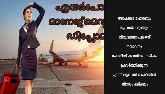 സംസ്ഥാന പൊതുവിദ്യാഭ്യാസവകുപ്പിന് കീഴിലുള്ള സ്റ്റേറ്റ് റിസോഴ്സ് സെന്ററിന്റെ നേതൃത്വത്തിൽ പ്രവർത്തിക്കുന്ന എസ്.ആർ.സി കമ്മ്യൂണിറ്റി കോളേജ് 2023 ജനുവരി സെഷനിൽ ആരംഭിക്കുന്ന ഡിപ്ലോമ ഇൻ എയർപോർട്ട് മാനേജ്മെന്റ് (DAM) പ്രോഗ്രാമിലേക്ക് പ്ലസ്ടു അഥവാ തത്തുല്യയോഗ്യതയോ ഉള്ളവർക്ക് അപേക്ഷിക്കാം. പ്രോഗ്രാമിൽ മികവ് പുലർത്തുന്നവർക്ക് തൊഴിൽ ഉറപ്പുവരുത്തുന്നതിനുള്ള സേവനങ്ങളും എയർപോർട്ട് മാനേജ്മെന്റ് രംഗത്തുള്ള ഏജൻസികളുടെ സഹകരണത്തോടെ നടത്തുന്നതാണ്. അപേക്ഷാ ഫോറവും പ്രോസ്പെക്ടസും തിരുവനന്തപുരത്ത് നന്ദാവനം പോലീസ് ക്യാമ്പിനു സമീപം പ്രവർത്തിക്കുന്ന എസ്.ആർ.സി ഓഫീസിൽ നിന്നും ലഭിക്കും. വിലാസം: ഡയറക്ടർ, സ്റ്റേറ്റ് റിസോഴ്സ് സെന്റർ, നന്ദാവനം, വികാസ് ഭവൻ പി.ഒ, തിരുവനന്തപുരം-33. ഫോൺ നം: 9846033001 https://srccc.in/download എന്ന ലിങ്കിൽ നിന്നും അപേക്ഷാഫാറം ഡൗൺലോഡ് ചെയ്ത് അപേക്ഷിക്കാ വുന്നതാണ്. വിശദാംശങ്ങൾ www.srccc.in എന്ന വെബ്സൈറ്റിൽ ലഭ്യമാണ്. പൂരിപ്പിച്ച അപേക്ഷകൾ ലഭിക്കേണ്ട അവസാന തീയതി ഫെബ്രുവരി 15 ആണ്.