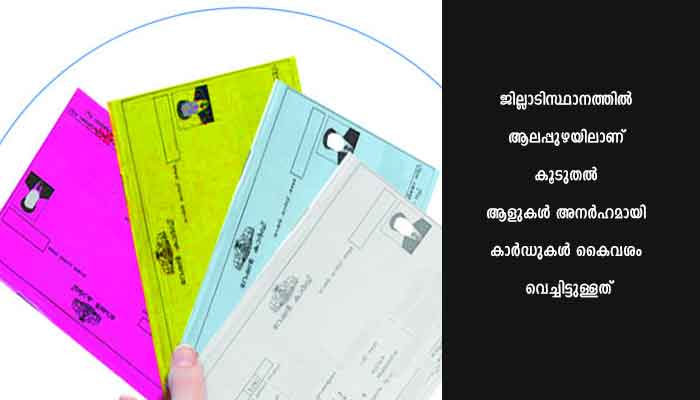 ജില്ലാടിസ്ഥാനത്തില് ആലപ്പുഴയിലാണ് കൂടുതല് ആളുകള് അനര്ഹമായി കാര്ഡുകള് കൈവശം വെച്ചതായി കണ്ടെത്തിയത്-8896, രണ്ടാമത് പത്തനംതിട്ട-5572. ആകെ 3,31,152 പുതിയ റേഷന് കാര്ഡുകള് അനുവദിച്ചു. ഇതില് 77962 പിങ്ക് കാര്ഡുകളും (പി.എച്ച്.എച്ച്) 246410 വെള്ള കാര്ഡുകളും (എന്.പി.എന്.എസ്) 6780 ബ്രൗണ് കാര്ഡുകളും (എന്.പി.ഐ) ആണ്. ഇതേ കാലയളവില് മാറ്റി കൊടുത്ത റേഷന് കാര്ഡുകളുടെ എണ്ണം 288271 ആണ്. ഇതില് 20712 മഞ്ഞ കാര്ഡുകളും 267559 പിങ്ക് കാര്ഡുകളുമാണ്. റേഷന് കാര്ഡുമായി ബന്ധപ്പെട്ട് ആകെ ലഭിച്ച ഓൺലൈന് അപേക്ഷകള് 4818143. ഇവയില് 4770733 അപേക്ഷകള് തീര്പ്പാക്കി. നിലവില് സംസ്ഥാനത്ത് ആകെ 93,37,202 റേഷന് കാര്ഡുകള് ആണുള്ളത്. ഇതില് 587806 മഞ്ഞ കാര്ഡുകളും 3507394 പിങ്ക് കാര്ഡുകളും 2330272 നീല കാര്ഡുകളും 2883982 വെള്ള കാര്ഡുകളും 27748 ബ്രൗണ് കാര്ഡുകളുമാണ്.