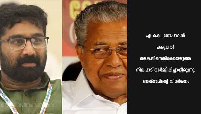 ‘പ്രിവന്റീവ് ഡിറ്റൻഷൻ എന്നത് ഇന്ത്യൻ ഭരണഘടന ആർട്ടിക്കിൾ 21 പ്രകാരം ഉറപ്പുനൽകുന്ന ജീവിക്കാനുള്ള അവകാശത്തിന്റെ ലംഘനമാണെന്നായിരുന്നു എ.കെ. ഗോപാലന്റെ വാദം. ആ എ.കെ. ഗോപാലന്റെ പിന്തുടർച്ച അവകാശപ്പെടുന്ന സി.പി.എമ്മിന്റെ പോളിറ്റ് ബ്യൂറോ അംഗം കൂടിയായ കേരള മുഖ്യമന്ത്രി തൃത്താലയിൽ ഒരു പരിപാടിക്ക് വരുന്നതിന്റെ ഭാഗമായി ജനപ്രതിനിധിയടക്കം നാല് കോൺഗ്രസ്- യൂത്ത് കോൺഗ്രസ് നേതാക്കളെയാണ് അറസ്റ്റ് ചെയ്ത് കരുതൽ തടങ്കലിലാക്കിയത്.