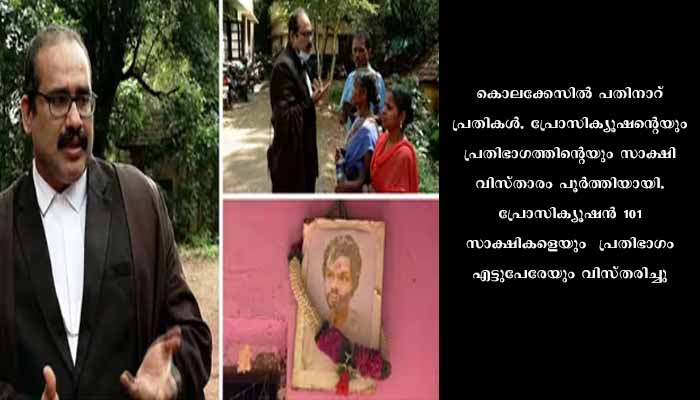 കൊലക്കേസിൽ പതിനാറ് പ്രതികൾ. പ്രോസിക്യൂഷന്റെയും പ്രതിഭാഗത്തിന്റെയും സാക്ഷി വിസ്താരം പൂർത്തിയായി. പ്രോസിക്യൂഷൻ 101 സാക്ഷികളെ വിസ്തരിച്ചു. പ്രതിഭാഗം എട്ടുപേരേയും.