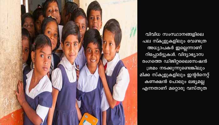 ഇന്ത്യയിലെ 8% സ്കൂളുകളിലും ഒരു അധ്യാപകൻ മാത്രമാണുള്ളത്. ജനസംഖ്യ കൂടുതലുള്ള സംസ്ഥാനങ്ങളിലാണ് ഒരു അധ്യാപകന് മാത്രമുള്ള സ്കൂളുകളുടെ എണ്ണം കൂടുതല്. എന്നാൽ കേരളത്തില് സ്ഥിതി വ്യത്യസ്തമാണ്. ഏറ്റവും കുറവ് ഏക അധ്യാപക വിദ്യാലയങ്ങള് ഉള്ള സംസ്ഥാനമാണ് കേരളം. 310 ഏക അധ്യാപക വിദ്യാലയങ്ങളാണ് കേരളത്തിലുള്ളത്. അതേസമയം രാജ്യത്തെ നാലിലൊന്ന് സ്കൂളുകളിൽ മാത്രമേ ഇന്റർനെറ്റ് സൗകര്യമുള്ളൂ എന്നും റിപ്പോർട്ടുകൾ സൂചിപ്പിക്കുന്നു.