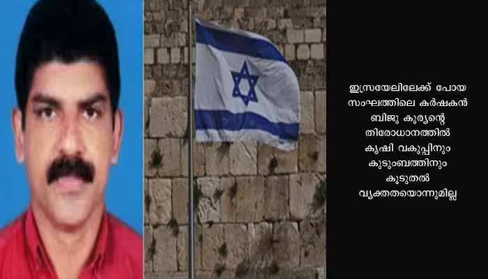 ഇസ്രയേലിലേക്ക് പോയ സംഘത്തിലെ കർഷകൻ ബിജു കുര്യന്റെ തിരോധാനത്തിൽ കൃഷി വകുപ്പിനും കുടുംബത്തിനും കൂടുതല് വ്യക്തതയൊന്നുമില്ല. താൻ സുരക്ഷിതനാണ് എന്ന് ഭാര്യക്ക് അയച്ച മെസേജിന് ശേഷം ബിജുവിനെ കുറിച്ച് ബന്ധുക്കൾക്കും വിവരമൊന്നുമില്ല. അതേസമയം, ബിജു കുര്യന്റെ അപേക്ഷ പരിശോധിച്ച് ഉറപ്പു വരുത്തിയിരുന്നുവെന്ന് പായം കൃഷി ഓഫീസർ കെ ജെ രേഖ പറഞ്ഞു.