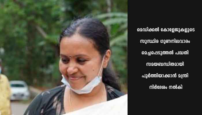 മെഡിക്കൽ കോളേജുകളുടെ സുസ്ഥിര ഗുണനിലവാരം മെച്ചപ്പെടുത്തൽ പദ്ധതി സമയബന്ധിതമായി പൂർത്തിയാക്കാൻ മന്ത്രി നിർദേശം നൽകി. ആദ്യഘട്ടമായി തിരുവനന്തപുരം മെഡിക്കൽ കോളേജിൽ നടപ്പിലാക്കിയ ക്വാളിറ്റി ഇംപ്രൂവ്മെന്റ് ഇനിഷേറ്റീവ് പദ്ധതി ആലപ്പുഴ, കോട്ടയം, തൃശൂർ, കോഴിക്കോട്, എറണാകുളം മെഡിക്കൽ കോളേജുകളിലേക്ക് വ്യാപിപ്പിക്കാൻ തീരുമാനിച്ചിരുന്നു. മെഡിക്കൽ കോളേജുകളിൽ ജനസൗഹൃദ അന്തരീക്ഷം സൃഷ്ടിക്കുക, ചികിത്സയുടെയും സേവനങ്ങളുടെയും ഗുണനിലവാരം മെച്ചപ്പെടുത്തുന്നതിന് ആരോഗ്യ പ്രവർത്തകർക്ക് മികച്ച അന്തരീക്ഷം സൃഷ്ടിക്കുക എന്നീ ലക്ഷ്യങ്ങളോടെയാണ് ഗുണനിലവാരം മെച്ചപ്പെടുത്താൻ പദ്ധതി നടപ്പിലാക്കി വരുന്നത്.