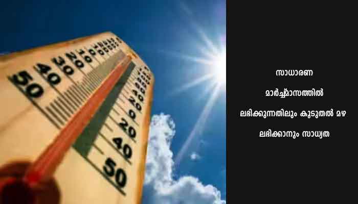 തിരുവനന്തപുരം: മാർച്ച് മാസത്തിൽ ചൂട് പതിവിലും അൽപം കുറയാൻ സാധ്യതയെന്ന് കേന്ദ്രകാലാവസ്ഥാ നിരീക്ഷണകേന്ദ്രം. സാധാരണ മാർച്ച് മാസത്തിൽ ലഭിക്കുന്നതിലും കൂടുതൽ മഴ ലഭിക്കാനും സാധ്യതയുണ്ടെന്നും. കേന്ദ്ര കാലാവസ്ഥാ നിരീക്ഷണകേന്ദ്രം പ്രവചിക്കുന്നു.