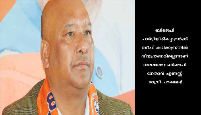 ബിജെപിയിൽ അത്തരം പ്രശ്നങ്ങളൊന്നുമില്ല. ജാതി, മതം തുടങ്ങിയ കാര്യങ്ങളൊന്നും ബിജെപി ചിന്തിക്കാറില്ല. ഞങ്ങൾക്ക് ഇഷ്ടമുള്ളത് കഴിക്കാം. അത് ഓരോരുത്തരുടേയും ഭക്ഷണ രീതിയാണ്. ഒരു രാഷ്ട്രീയ പാർട്ടിക്ക് അതിൽ കുഴപ്പം തോന്നേണ്ടതെന്തിന്?’- മാവ്രി പറഞ്ഞു. ബീഫ് കഴിക്കരുതെന്ന് ബിജെപി നേതൃത്വം പറഞ്ഞിട്ടില്ലെന്നും അദ്ദേഹം വ്യക്തമാക്കി. തെരഞ്ഞെടുപ്പിൽ മേഘാലയിൽ ബിജെപി മിന്നും വിജയം നേടുമെന്നാണ് ഏണസ്റ്റ് പ്രവചിച്ചത്. 34 സീറ്റിന്റെ ഭൂരിപക്ഷത്തോടെ വിജയിക്കുമെന്നും ഏണസ്റ്റ് ആത്മവിശ്വാസം പ്രകടിപ്പിച്ചു. ജനങ്ങൾക്ക് സമാധാനവും പുരോഗതിയും ആവശ്യമുണ്ടെങ്കിൽ ബിജെപി തന്നെ അധികാരത്തിൽ വരണമെന്നും ഏണസ്റ്റ് മാവ്രി പറഞ്ഞിരുന്നു.