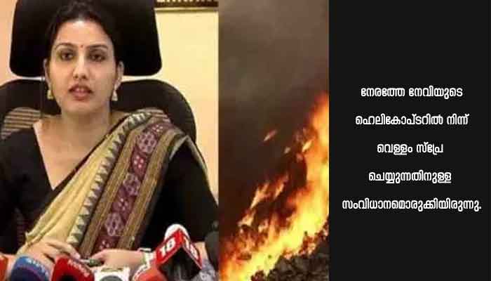 നേരത്തേ നേവിയുടെ ഹെലികോപ്ടറില് നിന്ന് വെള്ളം സ്പ്രേ ചെയ്യുന്നതിനുള്ള സംവിധാനമൊരുക്കിയിരുന്നു. എന്നാല് ഇത് തുടക്കത്തില് ഫലപ്രദമായിരുന്നെങ്കിലും പുക ഉയരുന്നതിനാല് അഗ്നിസേനാ വിഭാഗത്തിന് താഴെ നിന്ന് പ്രവര്ത്തിക്കാന് കഴിയാതെ വന്നു. അതിനാല് ഹെലികോപ്ടറിലെ വെള്ളമുപയോഗിച്ചുള്ള തീയണയ്ക്കല് തല്ക്കാലം നിര്ത്തിവച്ചിരിക്കുകയാണ്. ആവശ്യമെങ്കില് ഉപയോഗിക്കുമെന്നും കളക്ടര് പറഞ്ഞു.