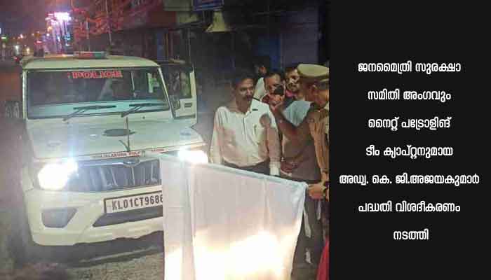 ജനമൈത്രി സുരക്ഷാ സമിതി അംഗവും നൈറ്റ് പട്രോളിങ് ടീം ക്യാപ്റ്റനുമായ അഡ്വ. കെ. ജി.അജയകുമാർ പദ്ധതി വിശദീകരണം നടത്തി. വനിതാ പോലീസുകാർക്ക് ഒപ്പം ക്രൈസ്റ്റ് കോളേജ് വിദ്യാർത്ഥികളും നൈറ്റ് പട്രോളിങ് ടീമിലുണ്ട്. വിദ്യാർത്ഥികൾക്ക് ഉള്ള യൂണിഫോം വിതരണവും മന്ത്രി നിർവഹിച്ചു.
