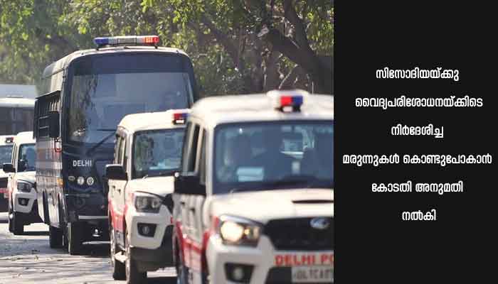 സിസോദിയയ്ക്കു വൈദ്യപരിശോധനയ്ക്കിടെ നിര്ദേശിച്ച മരുന്നുകള് കൊണ്ടുപോകാന് കോടതി അനുമതി നല്കി. ഒരു ജോഡി കണ്ണട, ഒരു ഡയറി, പേന, ഭഗവദ്ഗീത എന്നിവ കൈവശം വയ്ക്കാനും അനുവാദമുണ്ട്. സിസോദിയയുടെ അഭിഭാഷകന് ആവശ്യപ്പെട്ടതനുസരിച്ച്, അദ്ദേഹത്തെ ധ്യാനമുറിയില് പാര്പ്പിക്കണമെന്ന ആവശ്യം പരിഗണിക്കാന് ജയില് അധികൃതരോട് കോടതി നിര്ദേശിച്ചു.