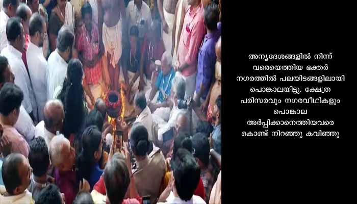 തിരുവനന്തപുരം: ഭക്തിസാന്ദ്രമായി അനന്തപുരി. പൊങ്കാല ചടങ്ങുകൾ തുടങ്ങി. പണ്ടാര അടുപ്പിൽ തീ പകർന്നു. ക്ഷേത്ര പരിസരവും നഗരവീഥികളും ഭക്ത സഹസ്രങ്ങളാൽ നിറഞ്ഞു. കൊവിഡിനെ തുടർന്ന് രണ്ട് വർഷത്തെ ഇടവേളക്ക് ശേഷം നടക്കുന്ന പൊങ്കാലക്ക് ഇത്തവണ അഭൂതപൂർവ്വമായ ജനത്തിരക്കാണ് അനുഭവപ്പെടുന്നത്. അന്യദേശങ്ങളിൽ നിന്ന് വരെയെത്തിയ ഭക്തർ നഗരത്തിൽ പലയിടങ്ങളിലായി പൊങ്കാലയിട്ടു. ക്ഷേത്ര പരിസരവും നഗരവീഥികളും പൊങ്കാല അർപ്പിക്കാനെത്തിയവരെ കൊണ്ട് നിറഞ്ഞു കവിഞ്ഞു. 07/03/23 ചൊവ്വാഴ്ച ഉച്ചയ്ക്ക് രണ്ടരയ്ക്കാണ് നിവേദ്യം. വിപുലമായ സുരക്ഷാ ക്രമീകരണങ്ങളും സൗകര്യങ്ങളുമാണ് നഗരത്തിലുടനീളം ഒരുക്കിയിട്ടുള്ളത്.
