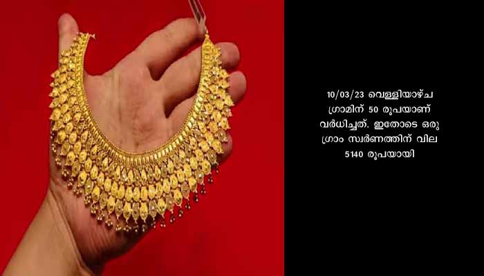 തിരുവനന്തപുരം: സംസ്ഥാനത്ത് സ്വർണവിലയിൽ വർധന. 10/03/23 വെള്ളിയാഴ്ച ഗ്രാമിന് 50 രൂപയാണ് വർധിച്ചത്. ഇതോടെ ഒരു ഗ്രാം സ്വർണത്തിന് വില 5140 രൂപയായി. ഒരു പവൻ സ്വർണത്തിന് വില 41,120 രൂപയാണ്. 18 കാരറ്റിന്റെ ഒരു ഗ്രാം സ്വർണത്തിന് വില 45 രൂപ വർധിച്ച് 4245 രൂപയായി. വെള്ളി നിരക്കിൽ മാറ്റമില്ല.