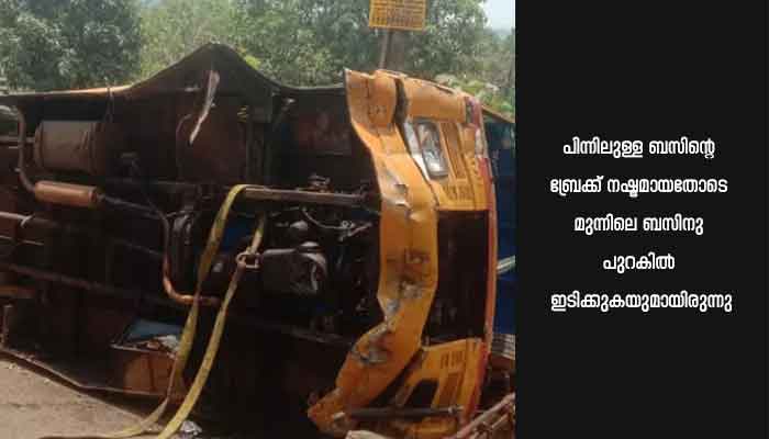 വെള്ളിയാഴ്ച ഉച്ചക്ക് 12 മണിയോടെ സ്കൂള് കോമ്പൗണ്ടില് കവാടത്തിനു സമീപമാണ് അപകടം. രാവിലെ കെ.ജി. വിദ്യാര്ഥികളുടെ പരീക്ഷ കഴിഞ്ഞശേഷം തിരികെ വീട്ടിലെത്തിക്കാന് കുട്ടികളെ ബസില് കയറ്റി രണ്ടു ബസുകള് ഒരുമിച്ചു പുറപ്പെടുകയും ഇതില് പിന്നിലുള്ള ബസിന്റെ ബ്രേക്ക് നഷ്ടമായതോടെ മുന്നിലെ ബസിനു പുറകില് ഇടിക്കുകയുമായിരുന്നു. ഇടിയുടെ ആഘാതത്തില് നിയന്ത്രണംവിട്ട് ബസ് മറിഞ്ഞു.
