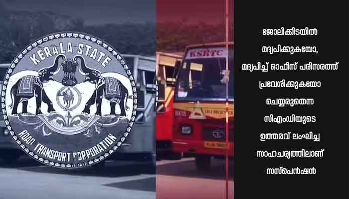 മദ്യപിച്ച് ഡ്യൂട്ടിക്കെത്തിയ പത്തനംതിട്ട ​ഗ്യാരേജിലെ സ്റ്റോർ ഇഷ്യൂവർ വി ജെ പ്രമോദാണ് സസ്പെൻഡ് ചെയ്യപ്പെട്ട ഡിപ്പോ ജീവനക്കാരൻ. മാർച്ച് 2 ന് ഡ്യൂട്ടിക്കെത്തിയ ഇയാളുടെ പെരുമാറ്റത്തിൽ പൊരുത്തക്കേട് കണ്ടെത്തിയിരുന്നു. തുടർന്ന് നടത്തിയ പരിശോധനയിൽ മദ്യപിച്ചതായി കണ്ടെത്തുകയായിരുന്നു. ജീവനക്കാർ മദ്യപിച്ച് ഡ്യൂട്ടിയിൽ ഹാജരാകുകയോ, ജോലിക്കിടയിൽ മദ്യപിക്കുകയോ, മദ്യപിച്ച് ഓഫീസ് പരിസരത്ത് പ്രവേശിക്കുകയോ ചെയ്യരുതെന്ന സിഎംഡിയുടെ ഉത്തരവ് ലംഘിച്ച സാഹചര്യത്തിലാണ് സസ്പെൻഷൻ.