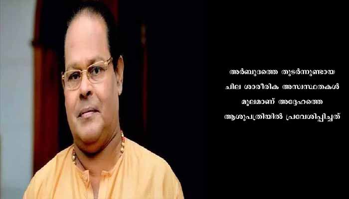 കൊച്ചി: നടനും മുൻ എം.പിയുമായ ഇന്നസെന്റ് ആശുപത്രിയിൽ. അർബുദത്തെ തുടർന്നുണ്ടായ ചില ശാരീരിക അസ്വസ്ഥതകൾ മൂലമാണ് അദ്ദേഹത്തെ ആശുപത്രിയിൽ പ്രവേശിപ്പിച്ചത്. കൊച്ചിയിലെ സ്വകാര്യ ആശുപത്രിയിൽ ചികിത്സയിലാണ്.