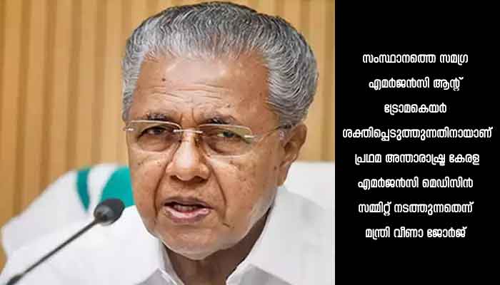 സംസ്ഥാനത്തെ സമഗ്ര എമർജൻസി ആന്റ് ട്രോമകെയർ ശക്തിപ്പെടുത്തുന്നതിനായാണ് പ്രഥമ അന്താരാഷ്ട്ര കേരള എമർജൻസി മെഡിസിൻ സമ്മിറ്റ് നടത്തുന്നതെന്ന് മന്ത്രി വീണാ ജോർജ് പറഞ്ഞു. അപകടങ്ങളിലൂടെയും ഗുരുതര രോഗങ്ങളിലൂടെയും എത്തുന്നവർക്ക് അടിയന്തര വിദഗ്ധ ചികിത്സ ഉറപ്പാക്കാൻ വലിയ പ്രവർത്തനങ്ങളാണ് നടത്തി വരുന്നത്. അത്യാഹിതങ്ങളിൽപ്പെട്ട രോഗികൾക്ക് ഗുണമേന്മയുള്ളതും സമയബന്ധിതവുമായ അടിയന്തര പരിചരണം ഉറപ്പാക്കാനായി ആരോഗ്യ വകുപ്പ് മെഡിക്കൽ കോളേജുകളിൽ ക്വാളിറ്റി ഇപ്രൂവ്മെന്റ് ഇനിഷ്യേറ്റീവ് നടപ്പിലാക്കി വരുന്നു. ഇതോടൊപ്പം അടിയന്തര വിദഗ്ധ ചികിത്സ ഉറപ്പാക്കാനുള്ള പരിശീലനങ്ങൾക്കും സർക്കാർ പ്രാധാന്യം നൽകി വരുന്നു. ഇതിനായി തിരുവനന്തപുരത്ത് സ്ഥാപിച്ച അപെക്സ് ട്രോമ ആന്റ് എമർജൻസി ലേണിഗ് സെന്ററിന് (എ.ടി.ഇ.എൽ.സി.) നൂതന ഉപകരണങ്ങൾ വാങ്ങാൻ അടുത്തിടെ 2.27 കോടി രൂപ അനുവദിച്ചിരുന്നു. ഇതുകൂടാതെയാണ് ലോകത്തിലെ വിവിധ ഭാഗങ്ങളിലെ മെഡിക്കൽ രംഗത്തെ വിദഗ്ധരെ ഉൾക്കൊള്ളിച്ച് സമ്മിറ്റ് നടത്തുന്നതെന്നും മന്ത്രി വ്യക്തമാക്കി.