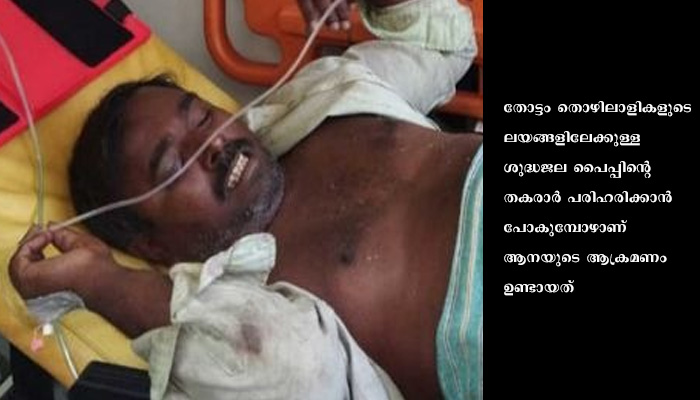 ആനയുടെ ആക്രമണത്തിൽ പരുക്കേറ്റ തൊഴിലാളിയെ തിരുവനന്തപുരം മെഡിക്കൽ കോളജ് ആശുപത്രിയിൽ പ്രവേശിപ്പിച്ചെങ്കിലും ചികിത്സയ്ക്കുള്ള പണമില്ലാതെ സഹായത്തിനെത്തിയവര് വലയുന്നു. തോട്ടം മാനേജ്മെന്റും വനവംകുപ്പും ചികിത്സയ്ക്കുള്ള സഹായം ചെയ്യുന്നില്ലെന്നാണ് കൂടെയുള്ളവർ പരാതി പറയുന്നത്. ജോലി സ്ഥലത്തു നിന്നും വന്നതിനാൽ ആരുടെ കൈയിലും വേണ്ടത്ര പണമില്ല. ചികിത്സയുടെ കാര്യത്തിൽ സർക്കാരിന്റെ അടിയന്തിര ഇടപെടിൽ ഉണ്ടാകണമെന്നാണ് തൊഴിലാളികളുടെ ആവശ്യം.