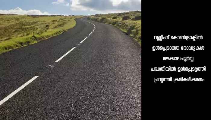 റണ്ണിംഗ് കോൺട്രാക്ട് പ്രവൃത്തിയിൽ ഉൾപ്പെട്ട റോഡുകളെല്ലാം ഗതാഗത യോഗ്യമാണെന്ന് ഉറപ്പുവരുത്താൻ മന്ത്രി നിർദേശിച്ചു. ഡ്രെയിനേജ് ശുചീകരണം ഉൾപ്പെടെയുള്ള പ്രീമൺസൂൺ പ്രവൃത്തികളും ക്രമീകരിക്കണം. റണ്ണിംഗ് കോൺട്രാക്ട് രണ്ടിലെ രണ്ടാംഘട്ട പ്രവൃത്തികളെല്ലാം യുദ്ധകാലാടിസ്ഥാനത്തിൽ ടെണ്ടർ നടപടികൾ പൂർത്തിയാക്കണം. റണ്ണിംഗ് കോൺട്രാക്ടിൽ ഉൾപ്പെടാത്ത റോഡുകൾ മഴക്കാലപൂർവ്വ പദ്ധതിയിൽ ഉൾപ്പെടുത്തി പ്രവൃത്തി ക്രമീകരിക്കണം. എല്ലാ പ്രവൃത്തികളും ഏപ്രിൽ 15 ന് തന്നെ ടെണ്ടർ നടത്തേണ്ടതും മെയ് ആദ്യവാരത്തോടെ പ്രവൃത്തി നടത്തേണ്ടതുമാണ്. കെആർഎഫ്ബി, കെഎസ്ടിപി, റിക്ക്, എൻഎച്ച് വിംഗുകളും ഇക്കാര്യത്തിൽ പ്രത്യേകമായി തന്നെ ശ്രദ്ധിക്കണമെന്ന് മന്ത്രി നിർദ്ദേശം നൽകി.