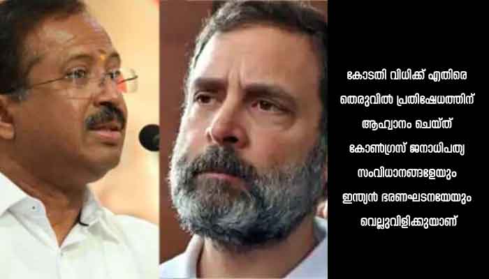 കോടതി വിധിക്ക് എതിരെ തെരുവിൽ പ്രതിഷേധത്തിന് ആഹ്വാനം ചെയ്ത് കോൺഗ്രസ് ജനാധിപത്യ സംവിധാനങ്ങളേയും ഇന്ത്യൻ ഭരണഘടനയേയും വെല്ലുവിളിക്കുയാണ്. പക്വതയില്ലാത്ത പ്രസ്താവനകളാണ് രാഹുലിനെ ഈ സ്ഥിതിയിൽ എത്തിച്ചതെന്ന് അദ്ദേഹം പറഞ്ഞു. പിന്നാക്ക സമുദായത്തോടും രാജ്യത്തെ ജനങ്ങളോടും മാപ്പ്പറയണമെന്നും അദ്ദേഹം പറഞ്ഞു.