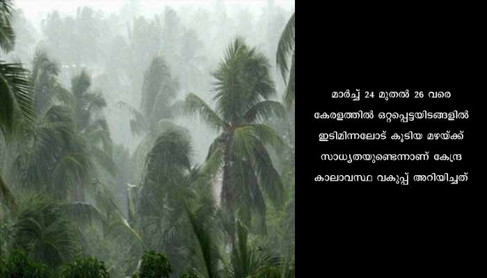 തിരുവനന്തപുരം: സംസ്ഥാനത്ത് 24/03/23 വെള്ളിയാഴ്ച മുതൽ അടുത്ത അഞ്ച് ദിവസം ഇടിമിന്നലോട് കൂടിയ മഴയ്ക്ക് സാധ്യതയെന്ന് കേന്ദ്ര കാലാവസ്ഥ വകുപ്പ്. മാർച്ച് 24 മുതൽ 26 വരെ കേരളത്തിൽ ഒറ്റപ്പെട്ടയിടങ്ങളിൽ ഇടിമിന്നലോട് കൂടിയ മഴയ്ക്ക് സാധ്യതയുണ്ടെന്നാണ് കേന്ദ്ര കാലാവസ്ഥ വകുപ്പ് അറിയിച്ചത്.