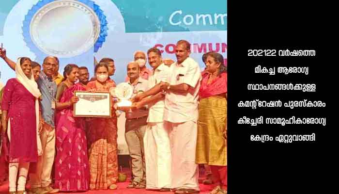ആമ്പല്ലൂർ: 2021-22 വർഷത്തെ മികച്ച ആരോഗ്യ സ്ഥാപനങ്ങൾക്കുള്ള കമന്റ്റേഷൻ പുരസ്കാരം കീച്ചേരി സാമൂഹികാരോഗ്യ കേന്ദ്രം ഏറ്റുവാങ്ങി. തിരുവനന്തപുരം നിശാഗന്ധി ഓഡിറ്റോറിയത്തിൽ വച്ച് നടന്ന ചടങ്ങിൽ ആരോഗ്യ വകുപ്പ് മന്ത്രി വീണാ ജോർജിൽ നിന്ന് മുളന്തുരുത്തി ബ്ലോക്ക് പഞ്ചായത്ത് പ്രസിഡന്റ് രാജു പി. നായർ, മെഡിക്കൽ ഓഫീസർ ഡോ. അപ്പു സിറിയക്ക് എന്നിവർ ഏറ്റുവാങ്ങി.
