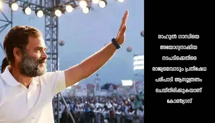 രാഹുൽ ഗാന്ധിയെ അയോഗ്യനാക്കിയ നടപടിക്കെതിരെ രാജ്യമെമ്പാടും പ്രതിഷേധ പരിപാടി ആസൂത്രണം ചെയ്തിരിക്കുകയാണ് കോൺഗ്രസ്. ‘സേവ് ഡെമോക്രസി’ മൂവ്മെന്റിനാണ് കോൺഗ്രസ് രൂപം നൽകിയിരിക്കുന്നത്. പാർട്ടി അധ്യക്ഷൻ മല്ലികാർജുൻ ഖാർഗെയുടെ നേതൃത്വത്തിൽ കോൺഗ്രസ് നേതാക്കളായ സോണിയാ ഗാന്ധി, പി ചിതംബരം എന്നിവരുൾപ്പെടെ ചേർന്ന യോഗത്തിലാണ് പ്രതിഷേധം സംബന്ധിച്ച് തീരുമാനമായത്.