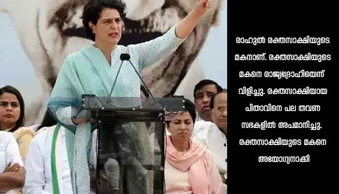 രാഹുല് രക്തസാക്ഷിയുടെ മകനാണ്. രക്തസാക്ഷിയുടെ മകനെ രാജ്യദ്രോഹിയെന്ന് വിളിച്ചു. രക്തസാക്ഷിയായ പിതാവിനെ പല തവണ സഭകളില് അപമാനിച്ചു. രക്തസാക്ഷിയുടെ മകനെ അയോഗ്യനാക്കി. ബി ജെ പിയുടെ കേന്ദ്ര മന്ത്രി ആ രക്തസാക്ഷിയുടെ ഭാര്യയെ അപമാനിച്ചു. ഞങ്ങളുടെ കുടുംബത്തെ നിരന്തരം അപമാനിച്ചു. എന്നിട്ടും ഇവര്ക്കാര്ക്കും രണ്ടു വര്ഷത്തെ തടവുശിക്ഷ ലഭിച്ചില്ല. ഇതൊക്കെയായിട്ടും രാഹുല് ഗാന്ധി പറഞ്ഞത് എനിക്ക് നിങ്ങളോട് വിദ്വേഷമില്ലെന്നാണ്. ബി ജെ പിയുടെ ഇത്തരം നയങ്ങള്ക്കും നിലപാടിനുമെതിരെ കോണ്ഗ്രസ് കൂടുതല് ശക്തിയോടെ പോരാടുമെന്നും പ്രിയങ്കാ ഗാന്ധി വ്യക്തമാക്കി. പ്രധാന മന്ത്രി ഭീരുവും അഹങ്കാരിയുമാണെന്നും പ്രിയങ്ക പറഞ്ഞു. അഹങ്കാരിയായ പ്രധാന മന്ത്രിയെ ജനങ്ങള് തിരിച്ചറിയും. തനിക്കെതിരെ കേസെടുക്കാന് പ്രിയങ്ക കേന്ദ്രത്തെ വെല്ലുവിളിച്ചു.